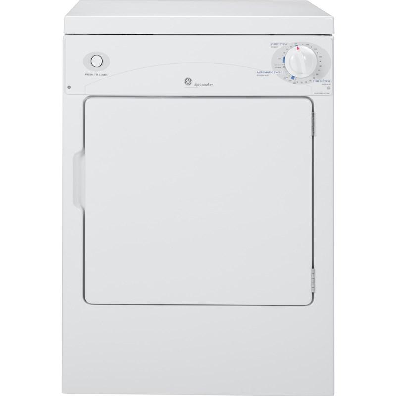 GE Spacemaker® 3.6 cu.ft. capacity portable electric dryer with 3 dry cycles, 3 heat selections, DuraDrum™ interior and Quiet-By-Design™ technology.