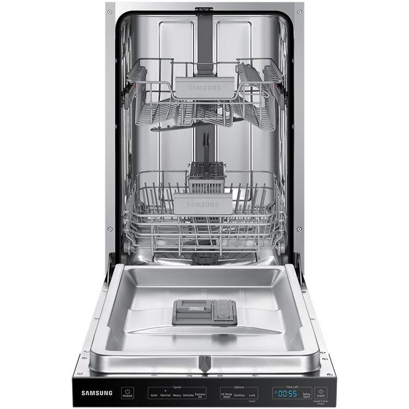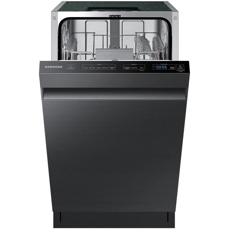 This 18-inch wide Samsung dishwasher features AutoRelease™ door, 5 wash programs, top controls and can accommodate up to 8 place settings.