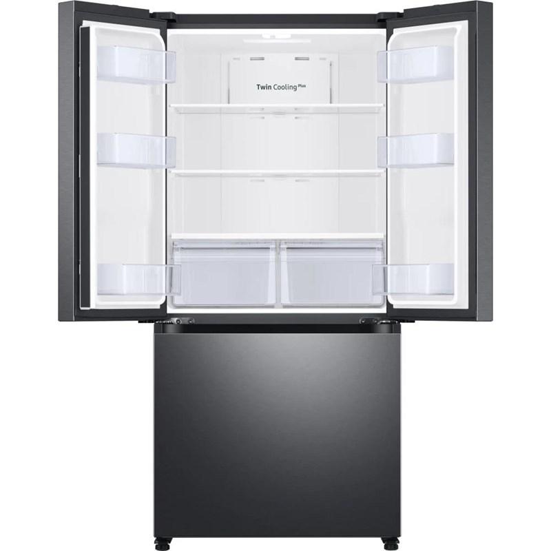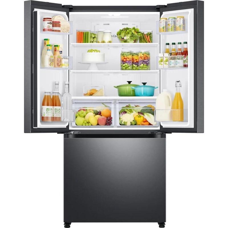 Samsung 18 cu. ft. smart counter depth 3-door french door refrigerator. This refrigerator features Twin Cooling Plus®, Power Cool & Freeze, an ice maker in the freezer that tores up to 5.5 lbs of ice, LED lighting, gallon door bins and humidity-controlled crispers.